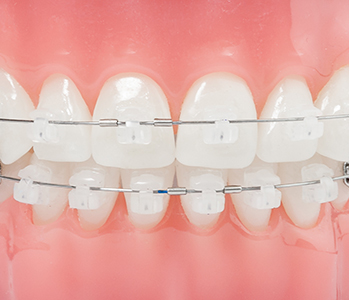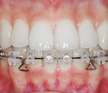 치아 색상과 흡사한 세라믹 재질의 브라켓을 치아 외부에 부착하는 것으로 기존 메탈 교정 장치에 비해 심미적인 장치입니다.